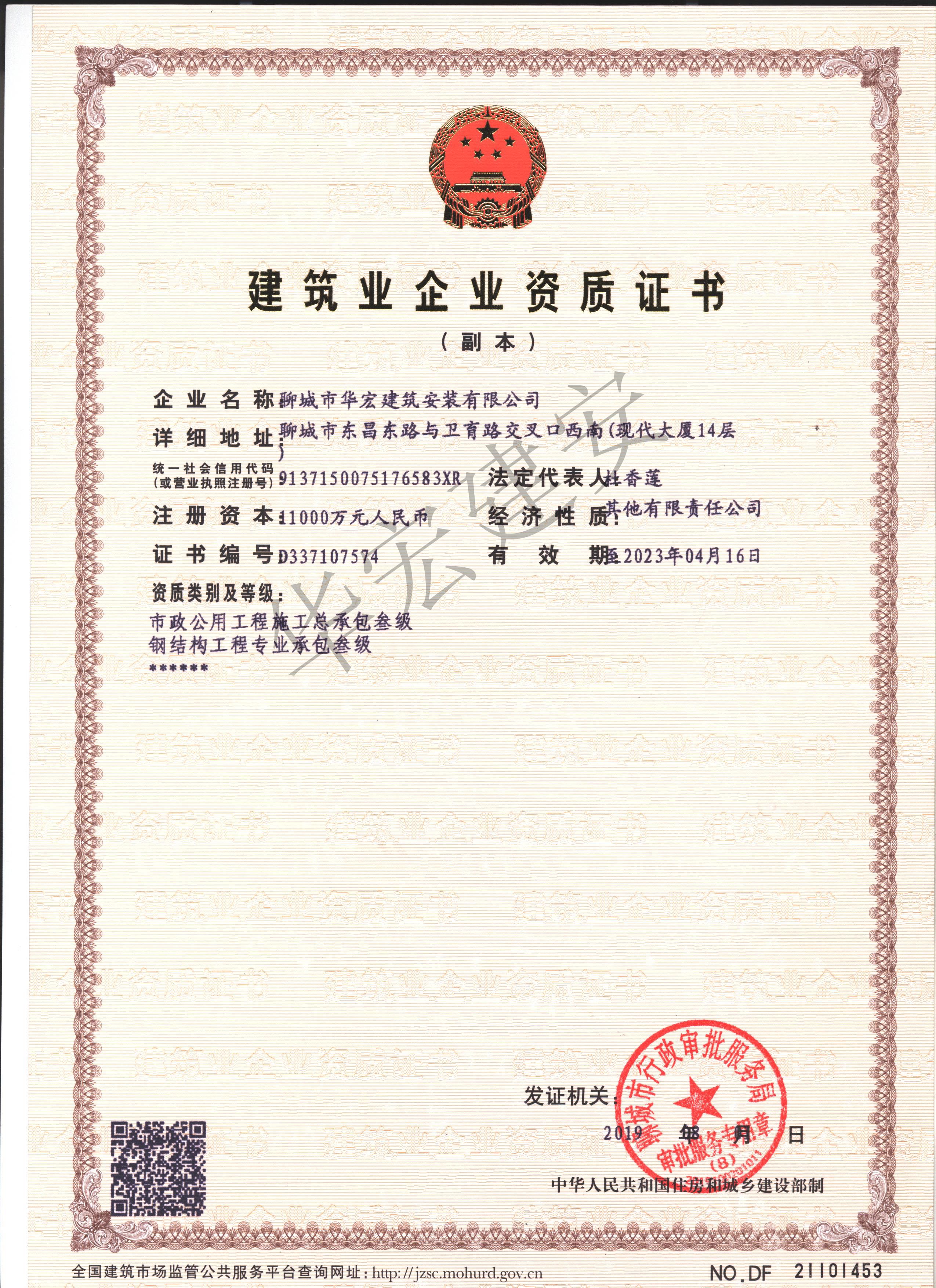 聊城市華宏建筑安裝有限公司成立于2002年5月,公司自2002年成立以來,不斷發揚 “敬業修身 打造精品 開拓創新 弄潮勇進”的創業精神,始終遵循“以質量求生存、靠精品創品牌、憑信譽贏市場”的宗旨,認真奉行“科學 高效 一流”的質量方針